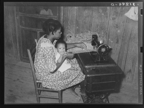 Wife of sharecropper, with baby in her lap, at sewing machine. Family will work under tenant purchase program. Near Caruthersville, Missouri