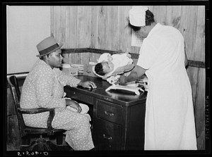 Nurse Shamburg weighing Ira Dencie Pettway’s baby in project clinic. Gee’s Bend, Alabama. John Collier, July 1942