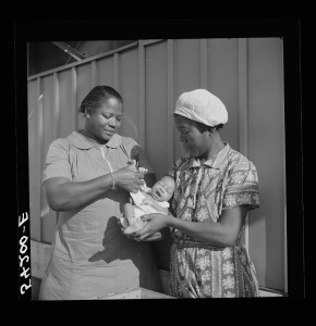 The nurse examines one of the camp’s first babies. Mother and child are given both prenatal and postnatal care by nurse and doctor at clinic too. Okeechobee migratory labor camp. Belle Glade, Florida