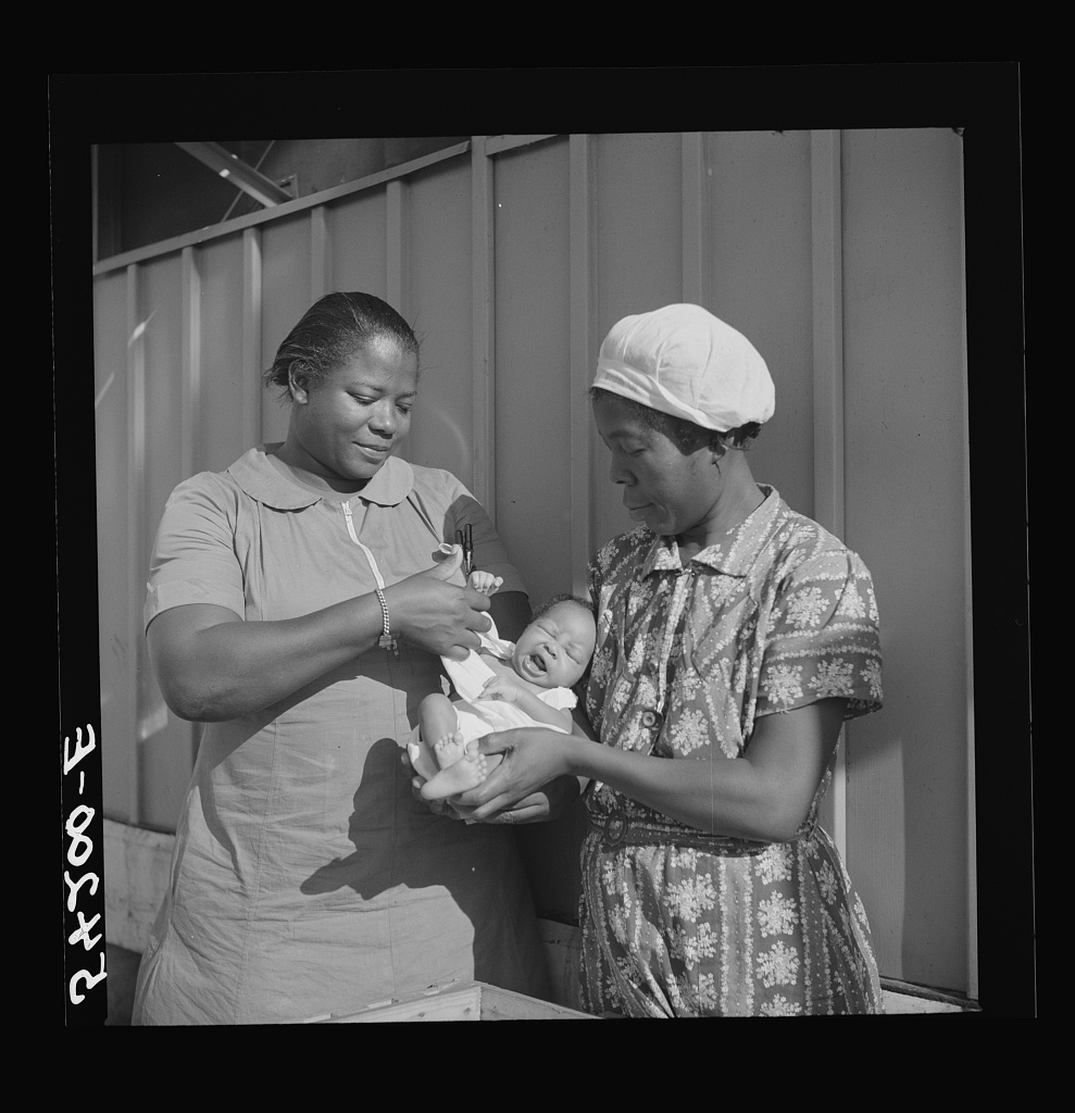 The nurse examines one of the camp’s first babies. Mother and child are given both prenatal and postnatal care by nurse and doctor at clinic too. Okeechobee migratory labor camp. Belle Glade, Florida
